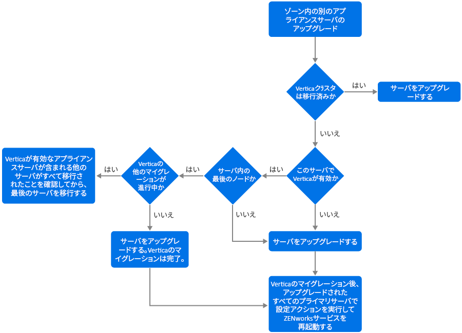 Verticaクラスタの最後のノードがアップグレードされた後で、設定アクションmicrofocus-zenworks-configure-c Startを実行して、今までにアップグレードされたすべてのプライマリサーバでZENworksサービスを再起動します。