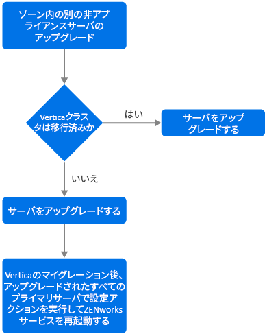Verticaが有効になっているすべてのアプライアンスサーバがすでに移行されている場合は、WindowsまたはLinuxサーバ(アプライアンス以外)をアップグレードして、手順4に進みます。サーバのアップグレードの詳細については、LinuxとWindowsプライマリサーバのZENworks 2020 Update 2へのアップグレードを参照してください。