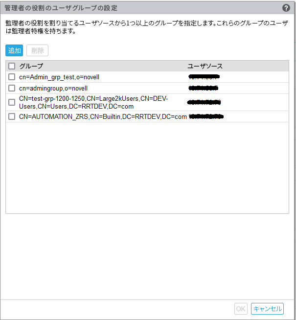 追加: 設定済みのユーザソースからグループを追加するには[追加]をクリックします。これらのグループは、設定された後で以下に一覧表示されます。