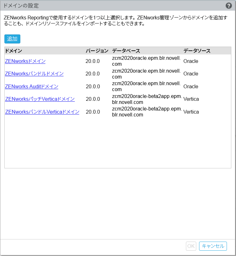 ZENworks Reportingで使用するドメインを1つ以上指定します。ZENworks管理ゾーンからドメインを追加、またはドメインリソースファイルをインポートできます。