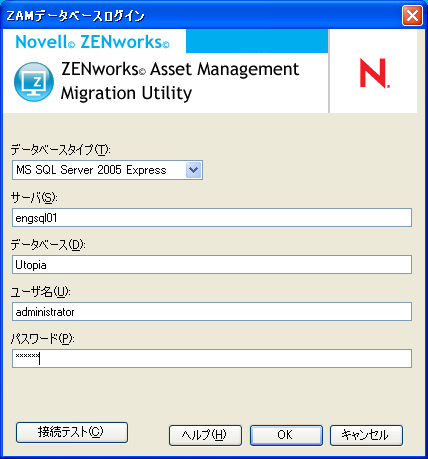 []フィールドは、ソースデータベースであるZENworks Asset Management 7.5データベースを示します。[データベースタイプ]フィールドの右にあるボタンをクリックして、[]ダイアログボックスを開きます。ここからソースデータベースにログインできます。Microsoft SQLのマイグレーションでは、次の画面が表示されます。