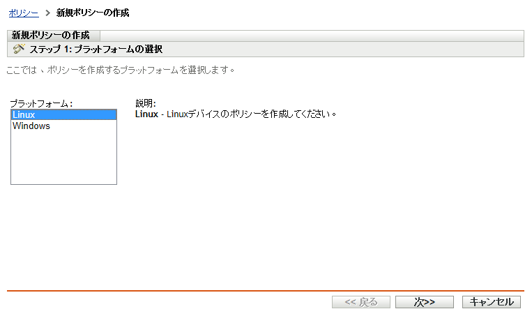 [ポリシー]パネルで、[]>[]の順にクリックして新規ポリシーの作成ウィザードを起動します。