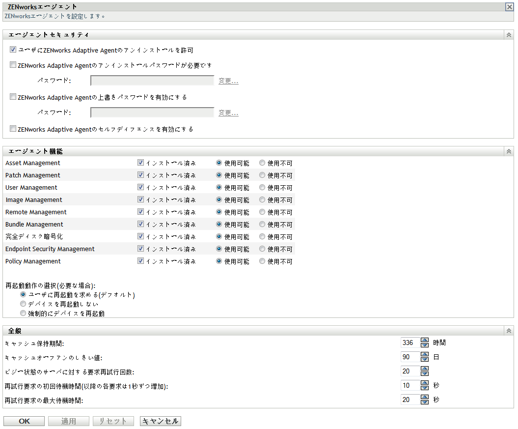 デフォルトでは、ZENworks製品をアクティブ化すると、そのAdaptive Agent機能のすべてがインストールされて有効になります。ただし、ZENworks Asset Managementだけは、ユーザ管理機能が自動的に有効になりません。