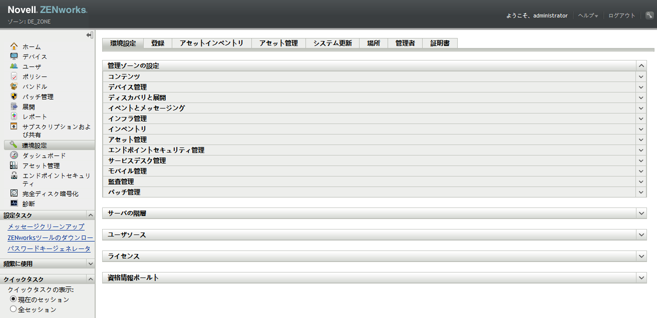 ZENworksコントロールセンターで、[環境設定]をクリックして、[環境設定]ページを表示します。