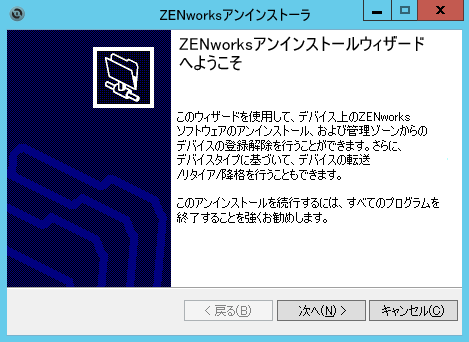 コマンドプロンプトで次のコマンドを実行して、ZENworksアンインストールプログラムを起動します。