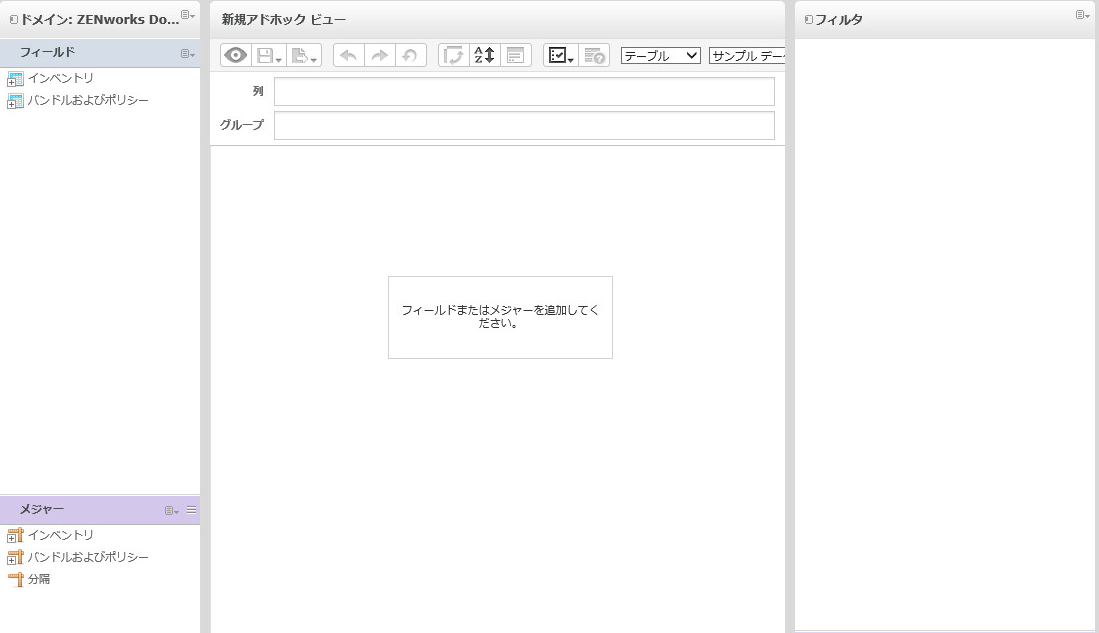 これらのフィールドのラベルと機能は、ビューによって異なります。フィールドおよびMeasures (メジャー)からアドホックビューに項目をドラッグアンドドロップできます。