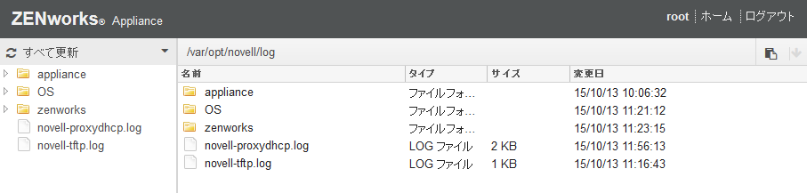 ここでは、ZENworksプライマリサーバのログを表示できます。ログは、Applianceログ、オペレーティングシステムログ、およびZENworksログに基づいて分類されます。ZENworks内では、異なるZENworksコンポーネントに基づいてログが分類されます。