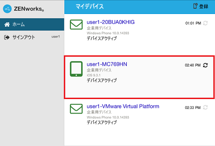 メモ:デバイスの状態が長時間登録が進行中のままの場合は、ZENworks User Portalで、デバイスに対して表示されている更新アイコンをタップします。