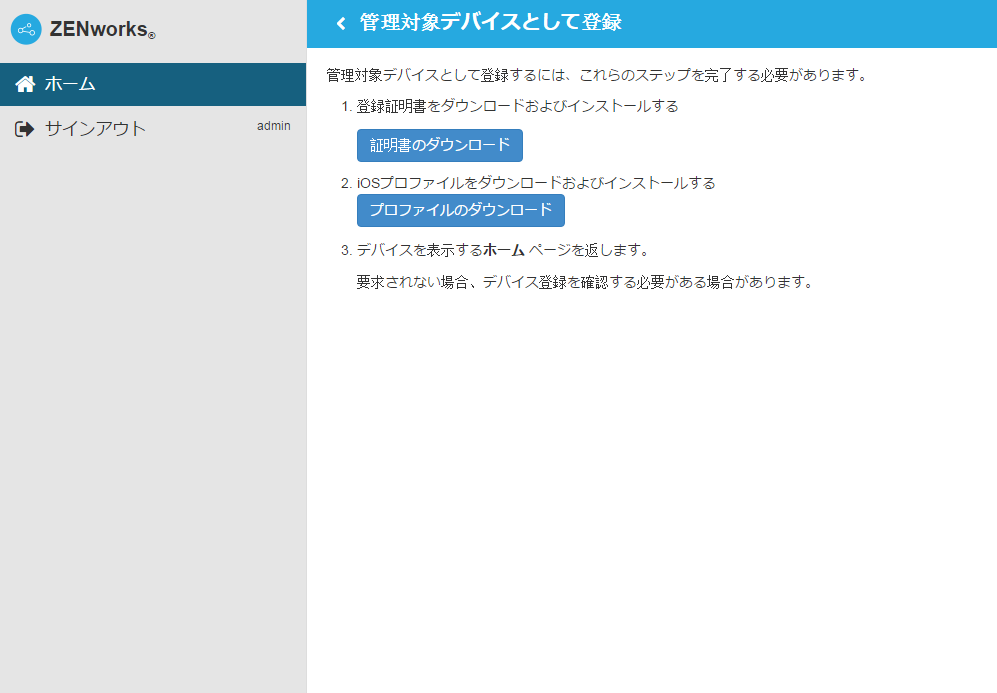 ZENworksデバイス登録プロファイルには、ZENworksでデバイスを管理するために必要なMDMプロファイルが含まれています。