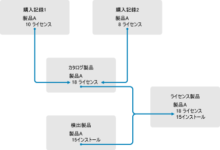 ソフトウェア製品の購入注文または請求書を示す購入記録を作成します。ライセンス購入記録の各細目には、カタログ製品と購入数量が表示されます。カタログ製品が複数の購入記録にリストされている場合、そのカタログ製品の総ライセンス数は両方の購入記録の購入数量に等しいです。上記の例において、1つの購入記録にはProductAの10個のライセンスがあり、もう1つの購入記録には8個のライセンスがあります。ProductAの総ライセンス数は18です。