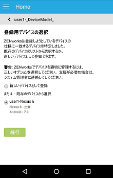 このようなシナリオの場合、モバイル登録ポリシーでユーザによる手動調整を許可を許可します。登録に失敗した場合、登録を完了するよう求める電子メールがZENworksからユーザに送信されます。ユーザが再度ZENworks User PortalにアクセスしてActiveSyncの登録を完了する場合、ユーザは適切なデバイス所有権タイプを選択する必要があります。その後、ZENworks管理ゾーンに登録されていて、ユーザに関連付けられているアクティブなAndroidデバイスがすべてZENworks User Portalに表示されます。これで、ユーザは適切なデバイスを選択し、既存のデバイスオブジェクトに合わせて手動でデバイスを調整できます。また、新しいデバイスとして登録を選択することもできます。続行をクリックします。