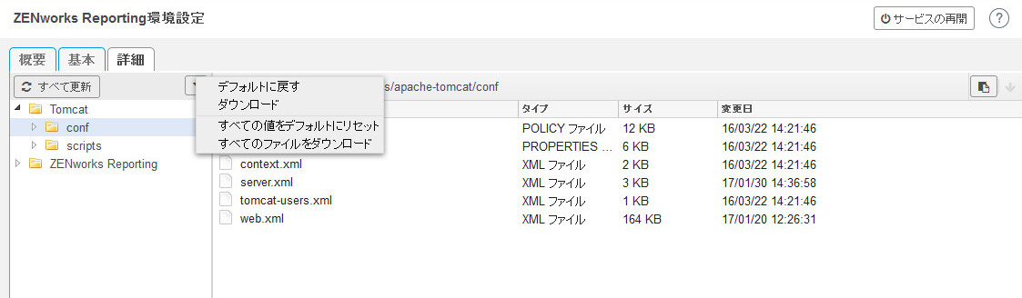 [詳細]ビューでは、Tomcat、ZENworks Reportingなど、ZENworks Reporting関連のすべてのサーバ環境設定ファイルを表示、設定、または編集できます。