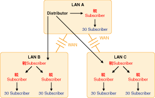 親Subscriberは、WANリンクに必ずしも必要なものではありません。たとえば、高速のWANリンクで接続されたLAN上にSubscriberが2つしか存在しない場合、Distributionを1回送信するときと2回送信するときのトラフィックの差はごくわずかです。ただし、低速のWANリンクでの結果は異なります。