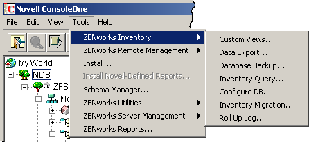 [Tools]>[ZENworks Inventory]の順にクリックすると、次のオプションが表示されます。