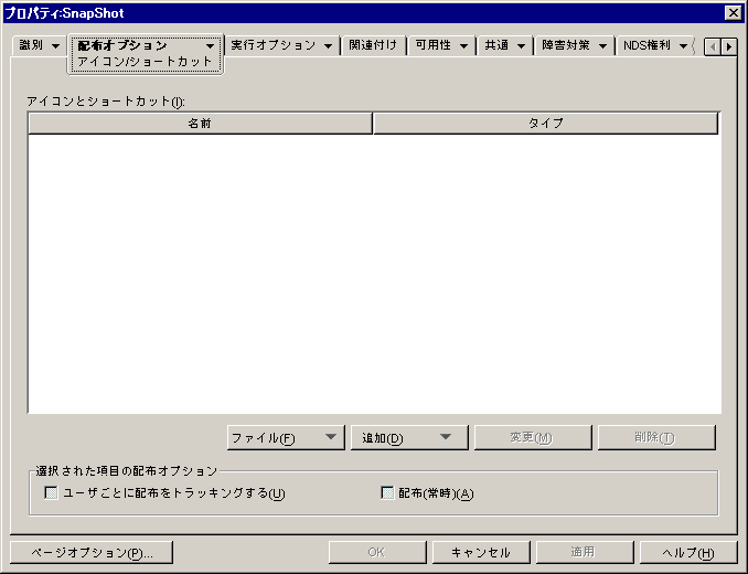 図 48-7 アプリケーションオブジェクト>[配布オプション]タブ>[アイコン/ショートカット]ページ