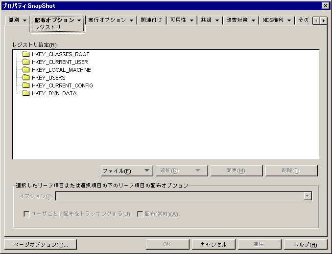 [配布オプション]では、アプリケーション配布時における個々のレジストリ設定([レジストリ設定]ツリー内)の処理方法を指定できます。