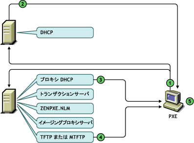 PXEが有効なワークステーションがブートを開始するときには、DHCP検出要求を送信して起動前サービスのイメージングサーバのIPアドレスを決定します。DHCPサーバはクライアントが使用するIPアドレスで応答し、プロキシDHCPサーバはトランザクションサーバ、TFTPサーバ、およびMTFTP (マルチキャストTFTP)サーバのIPアドレスと、起動前サービスクライアントのファイル名で応答します。