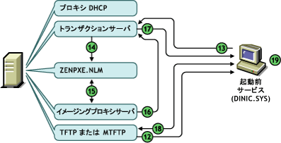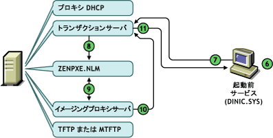 プロキシDHCPサーバは、起動前サービストランザクションサーバ、起動前サービスTFTP/MTFTPサーバのIPアドレス、および起動前サービスクライアント(dinic.sys)の名前で応答します。 起動前サービスクライアントには、オペレーティングシステムがロードされる前に、ネットワークでワークステーションを使用できるようにする起動前コンポーネントが含まれています。このコンポーネントによって、ワークステーションにオペレーティングシステムがインストールされていなくても、ワークステーションはトランザクションサーバに確実に接続できます(手順7)。 |