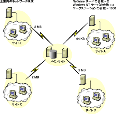 次の図は、サーバが複数の場所に分散している企業内ネットワークの編成を示しています。