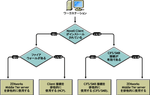 Novell Clientがワークステーションにインストールされていない場合、ZENMUPは、CIFS/SMB接続が存在するかどうかを調べます。存在する場合、ZENMUPはCIFS/SMB接続を排他的に使用します。CIFS/SMB接続が存在しない場合、ZENMUPはZENworks Middle Tier Serverを使用してファイルにアクセスします。