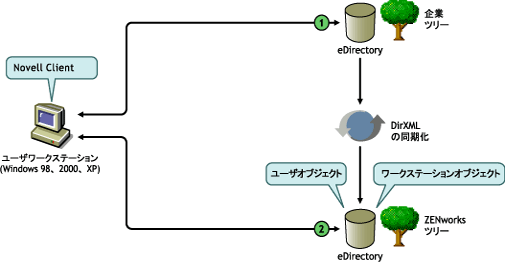 次の図は、Novell Clientを使用してZENworksツリーと企業ツリーに対し認証を同時に行う場合の簡略化されたプロセスを示しています。