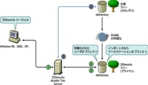 eDirectory企業ツリーの場合は、Novell ClientまたはZENworks管理エージェントのどちらをZENworks Middle Tier Serverと組み合わせて使用しても、ユーザは個々のZENworksツリー(企業ツリーと同期されたユーザオブジェクトを含む)を認証できます。