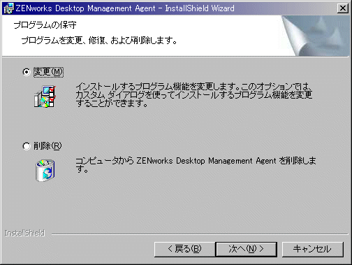ユーザワークステーションでデスクトップ管理エージェントを変更する必要がある場合、デスクトップ管理エージェントインストールプログラムを再度実行することにより、ローカルに実施できます。もう一度インストールを開始すると、デスクトップ管理エージェントのメンテナンスダイアログボックスが表示されます。
