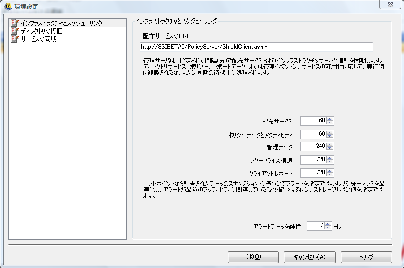 インフラストラクチャとスケジューリングモジュールでは、ZENworks Endpoint Security Management管理者は、ポリシー配布サービスのURLの指定および変更のほか、ZENworks Endpoint Security Managementコンポーネントの同期間隔を制御できます。