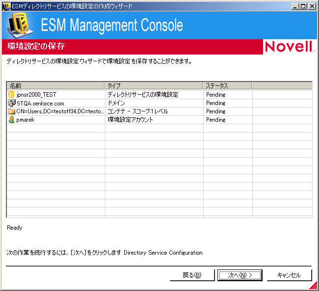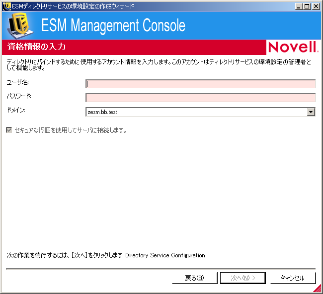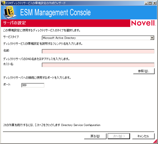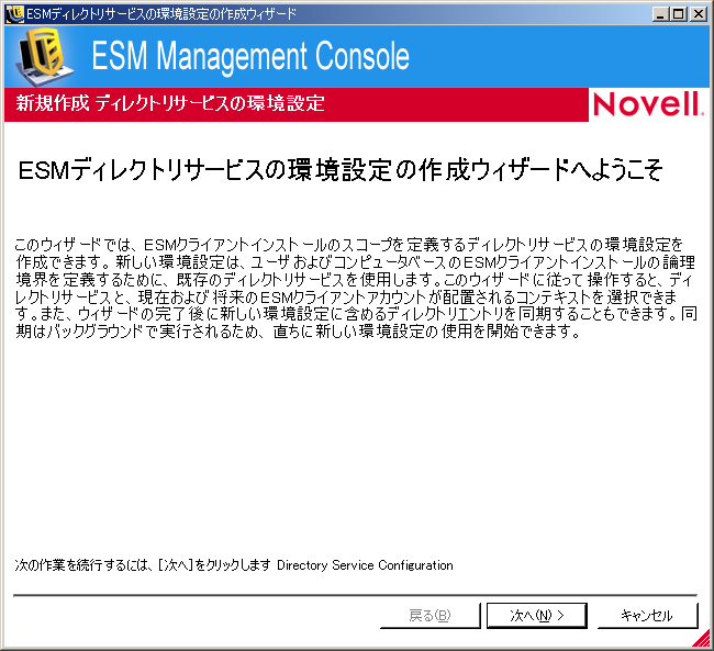 ZENworks Endpoint Security Managementのインストール後に、ディレクトリサービスの環境設定の作成ウィザードが自動的に表示されます。製品のインストールが完了し、ようこそページが表示されたら、次の手順のステップ 4にスキップします。