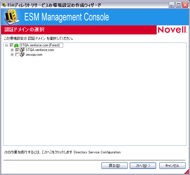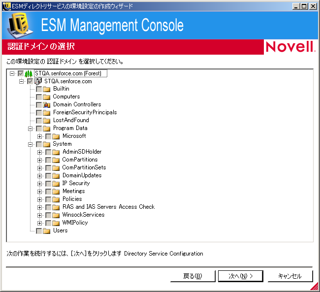 [Select Authenticating Domains(s) (認証ドメインの選択)]ページで、ツリーを参照し、この環境設定のユーザおよびコンピュータを認証するために使用するドメインを選択します。