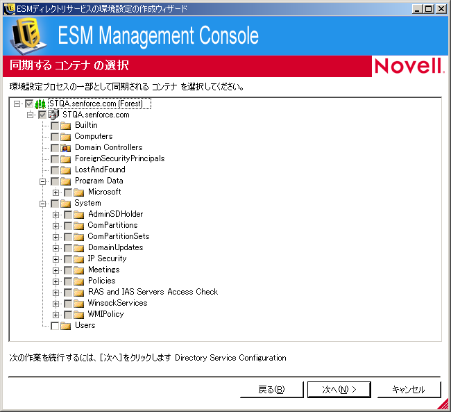 ステップ 7で指定した管理者ユーザを含むコンテナが選択されていますが、この選択を解除することはできません。