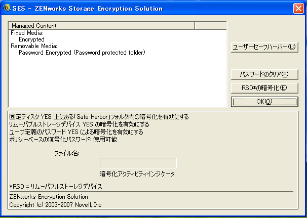 ZENworks Endpoint Securityが実行中の場合、これらのデバイスに保存されているファイルは、オペレーティングシステムやユーザからアクセスされるたびに暗号化されます。これらのデバイスにコピーされたファイルは直ちに暗号化されます。リムーバブルストレージデバイスをZENworks Endpoint Securityシステムで管理されていないコンピュータに接続すると、これらのファイルは暗号化されたままになり、復号化できません。
