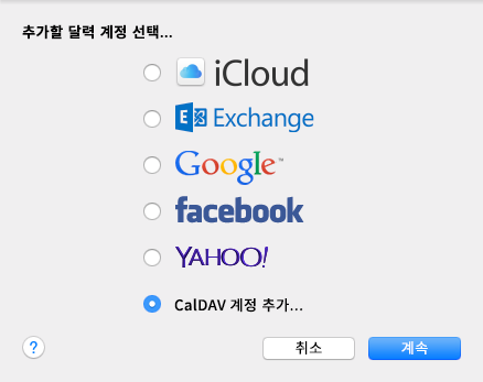 Mac 캘린더 앱에서 [캘린더] > [계정 추가]를 선택합니다.