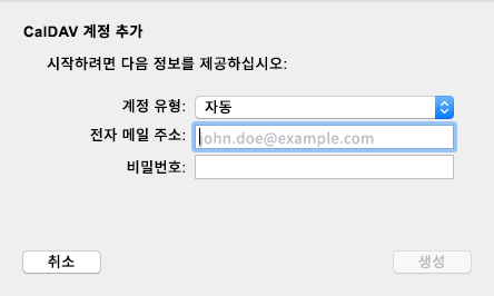Mac 캘린더 앱을 구성하려면 GroupWise 달력 서버 IP 주소 또는 DNS 이름이 있어야 합니다. 관리자가 GroupWise 달력 서버의 자동 검색을 구성한 경우에는 필요하지 않을 수 있습니다.