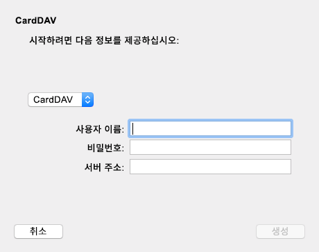 Mac 연락처 앱에서 [연락처] > [계정 추가]를 선택합니다.