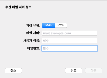 IMAP 서버를 지정합니다. 사용자 이름 및 비밀번호를 미리 작성해야 합니다.