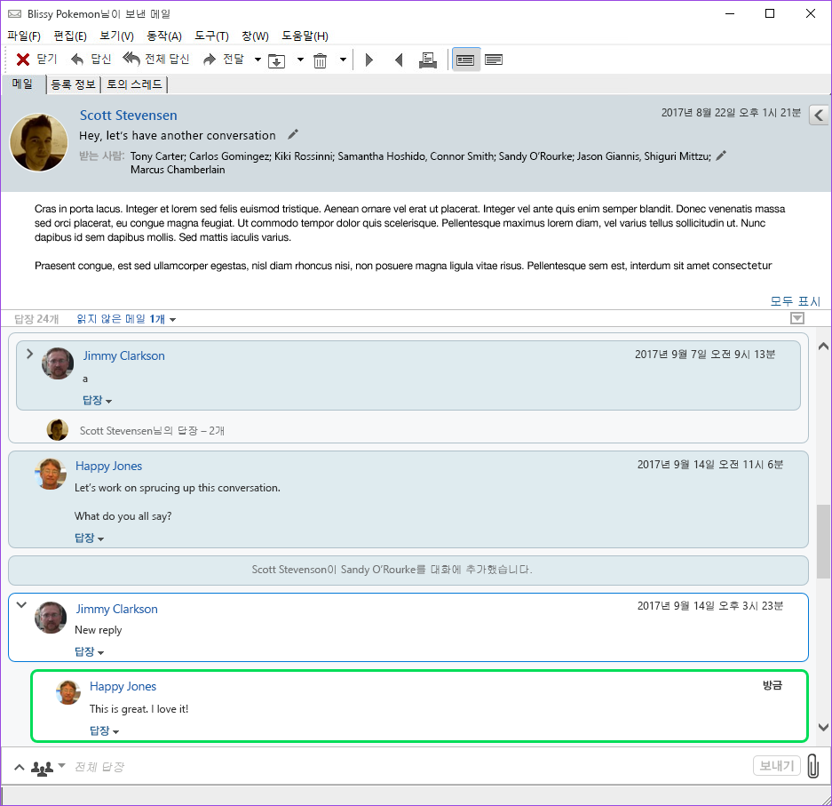 대화의 새 응답에는 녹색 테두리가 있습니다. 메시지를 읽은 후 3분 동안 녹색으로 유지됩니다. 항목 옆에 있는 읽지 않은 녹색 숫자를 마우스 오른쪽 버튼으로 클릭하여 항목 목록의 항목에서 읽지 않은 항목을 지울 수 있습니다.