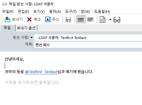 멘션 기능을 사용하면 [항목 보내기]의 메시지 본문에서 주소록 이름 완성을 사용하여 받는 사람 필드에 수신인을 빠르게 추가할 수 있을 뿐만 아니라, 링크된 강조 표시된 이름이 메시지 텍스트에 삽입되어 해당 수신인이 유의하도록 할 수 있습니다.