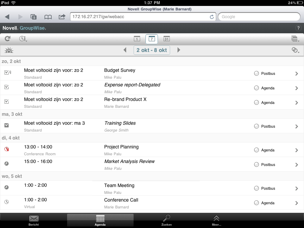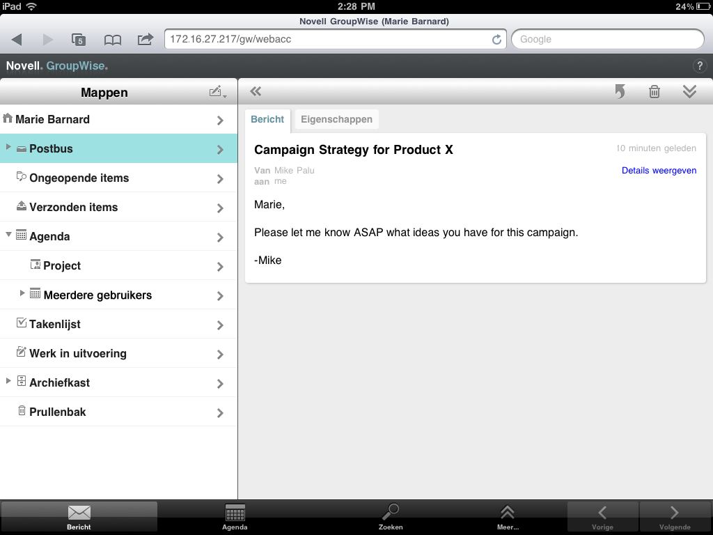 Wanneer u zich via de webbrowser van uw tablet bij GroupWise aanmeldt, wordt uw postbus weergegeven.
