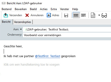In het onderstaande voorbeeld heeft de opsteller van het bericht 'LDAP-gebruiker' toegevoegd aan het Naar-veld en sprak hij hem aan als 'meneer' in de tekst van het bericht. Tijdens het typen van de eerste zin typte de opsteller van het bericht '@test' en kon vervolgens de TestFirst TestLast-gebruiker uit de pop-uplijst van het adresboek selecteren voor Naam aanvullen. Deze laatste actie voegt de naam van de gekoppelde ontvanger toe aan de tekst van het bericht en voegt die gebruiker toe in het Naar-veld van het e-mailbericht.