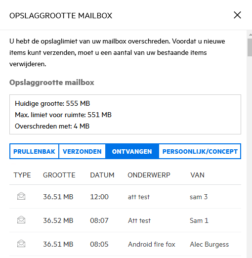 Geel - De omvang van het postvak heeft de waarschuwingsdrempel overschreden die door de beheerder is ingesteld.