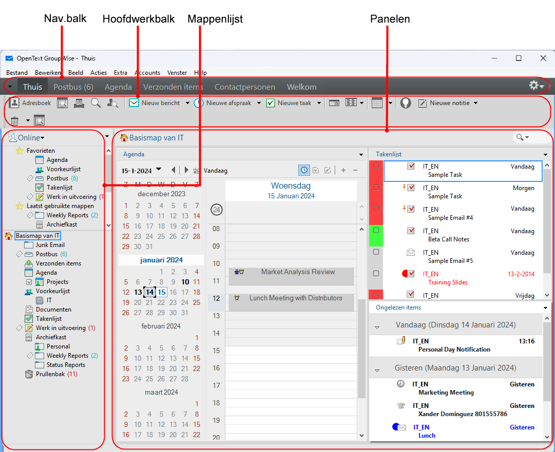 Het hoofdwerkgebied in GroupWise is het hoofdvenster. In het hoofdvenster kunt u berichten lezen, afspraken plannen, de agenda bekijken, contactpersonen beheren, de huidige modus van GroupWise wijzigen, mappen openen, documenten openen, en nog veel meer.