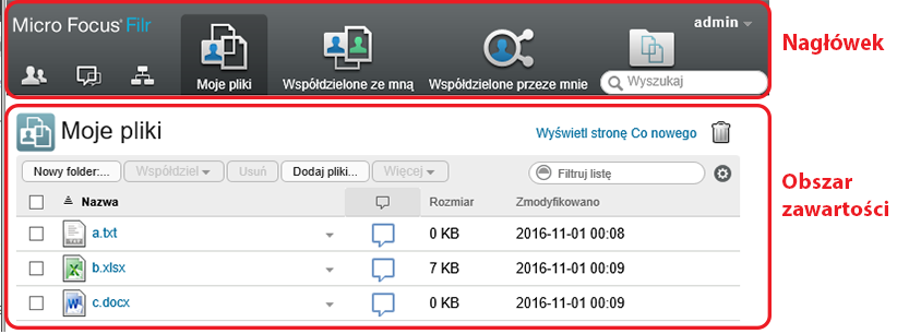 Obszar zawartości systemu Filr to miejsce, w którym jest wyświetlana większość informacji.