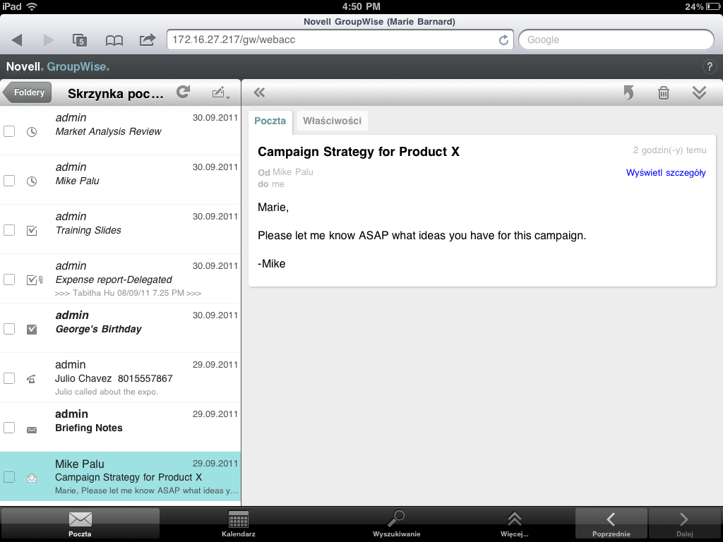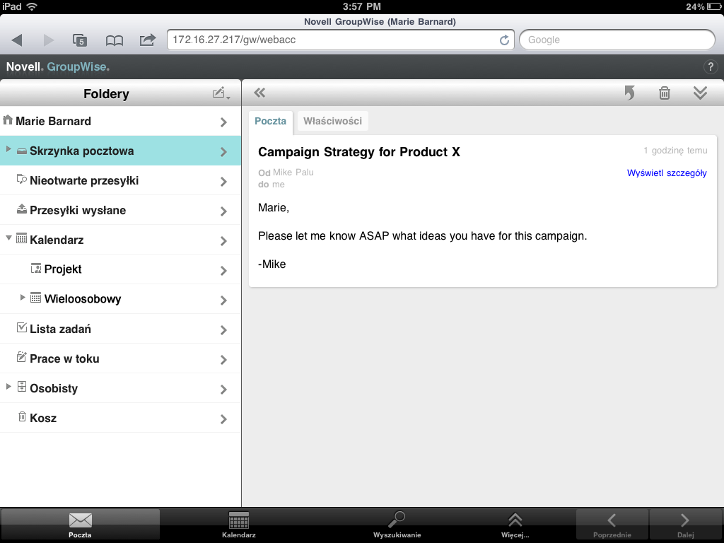 Po zalogowaniu się do systemu GroupWise za pomocą przeglądarki sieci Web na urządzeniu tablet zostanie wyświetlona skrzynka pocztowa.