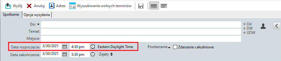 Funkcja Strefa czasowa pozwala zaplanować spotkanie dla odbiorców z różnych stref czasowych, mających się spotkać w jednym miejscu.