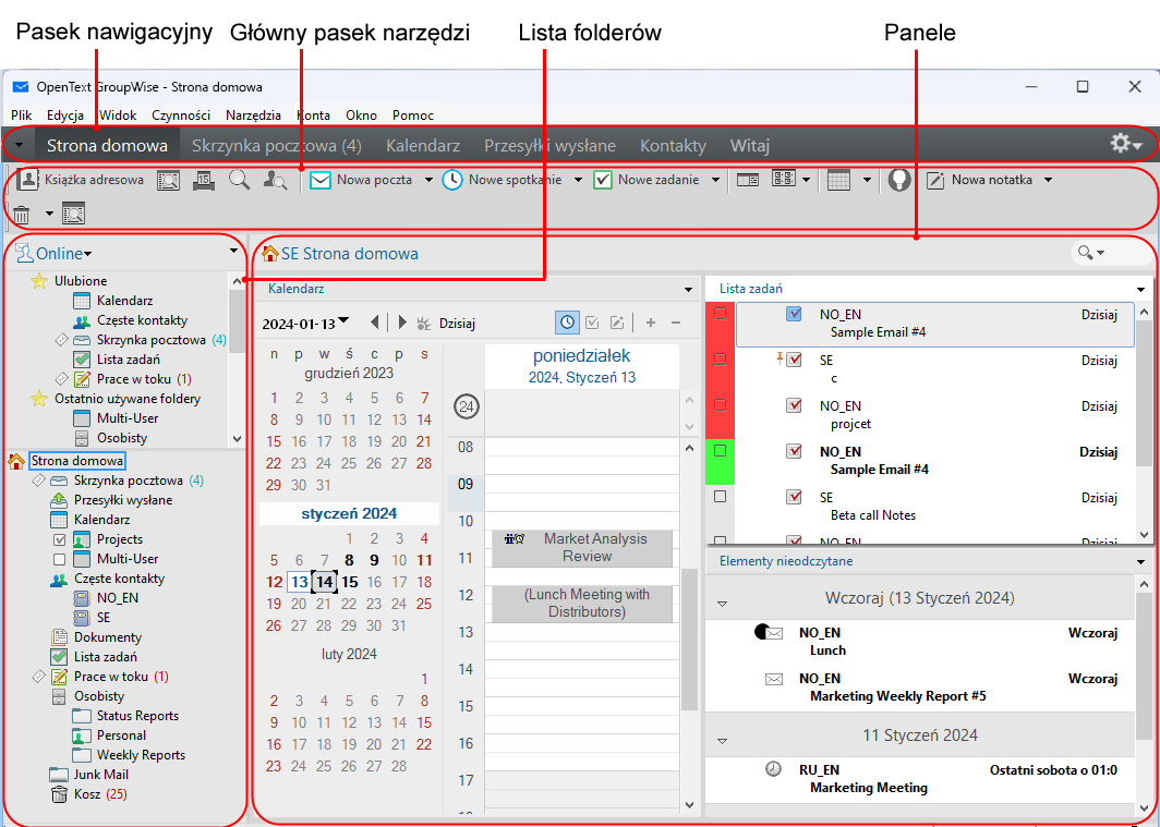 Podstawowy obszar roboczy użytkownika w programie GroupWise nosi nazwę okna głównego. W głównym oknie można czytać otrzymane wiadomości, przeglądać harmonogram zadań i kalendarz, zarządzać kontaktami, zmieniać bieżący tryb pracy programu GroupWise, otwierać foldery, dokumenty i wiele więcej.