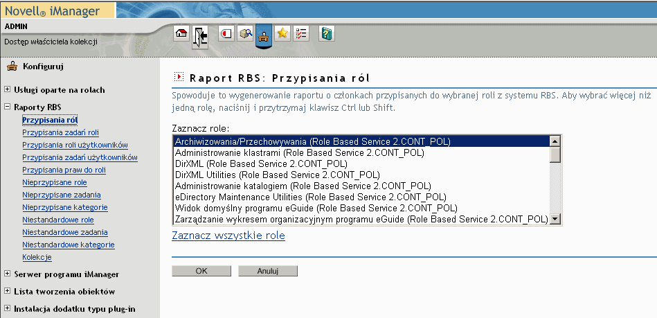Przed utworzeniem każdego raportu wymagane jest podanie określonych informacji, na przykład ról, dla których ma zostać utworzona lista przypisanych członków. Raport zostanie utworzony po podaniu informacji i kliknięciu przycisku OK.