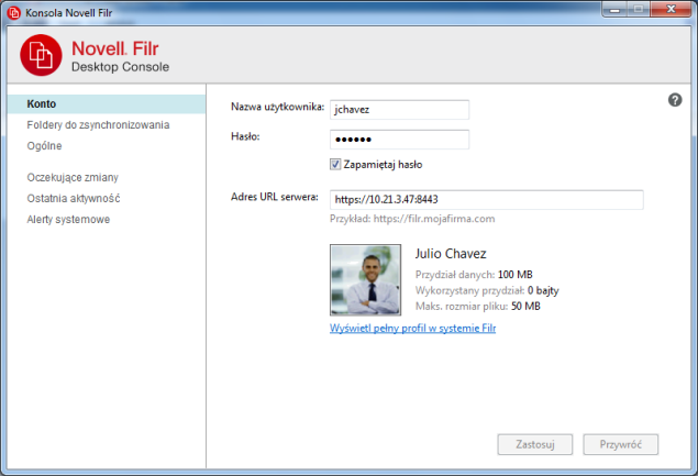 Adres URL serwera. Podaj adres URL witryny Filr, z której chcesz synchronizować pliki z komputerem. Na przykład https://Filr.moja_firma.com:8443.