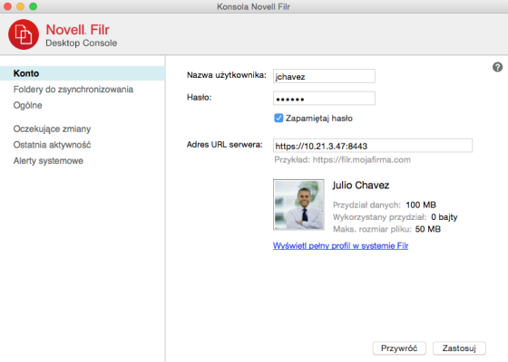 Adres URL serwera. Podaj adres URL witryny Filr, z której chcesz synchronizować pliki z komputerem. Na przykład https://Filr.moja_firma.com:8443.