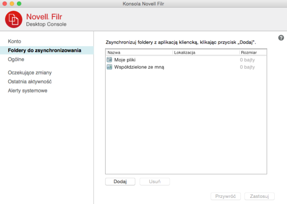 Podczas pierwszej konfiguracji aplikacji klienckiej Filr możesz wybrać synchronizowane foldery. Foldery Moje pliki i Współdzielone ze mną są synchronizowane domyślnie. Synchronizację folderów sieciowych i publicznych należy skonfigurować ręcznie. Foldery do synchronizacji można skonfigurować podczas początkowej konfiguracji lub w dowolnym czasie po zakończeniu początkowej konfiguracji.
